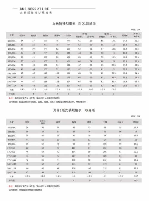 女长短袖规格表
